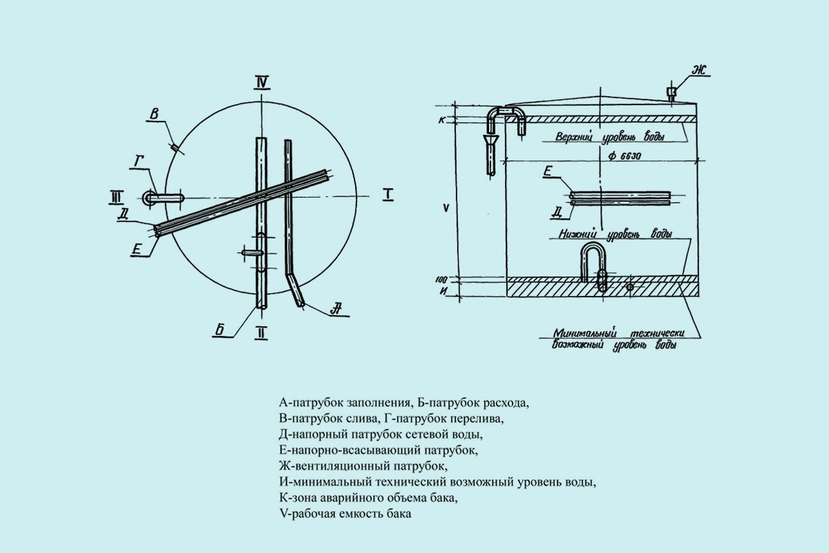 Для изготовления бака используется рулонная сталь толщиной от 4 мм. Вертикальный цилиндрический резервуар устанавливается на ровное основание (бетон, асфальтовое покрытие). Плоское днище усилено утолщенными окрайками. Коническая щитовая крыша опирается на центральную опору и стенки цилиндра. В корпусе предусмотрены патрубки для наполнения емкости и слива воды, а также технологические люки для обслуживания. Бак-аккумулятор комплектуется металлической лестницей и технической площадкой. В качестве изоляции используется маты из минеральной ваты. Обшивается теплоизоляционный слой стальным листом толщиной 0,7 мм. В дополнительную комплектацию входят бандажи, защищающие конструкцию от разрушения при больших ветровых и снеговых нагрузках.