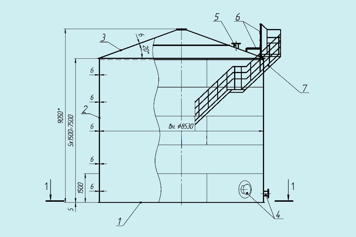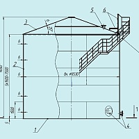 1- днище, 2 - стенка, 3 - крыша, 4, 5 - люки и патрубки, 6 - площадка кольцевая и ограждение, 7 - лестница кольцевая