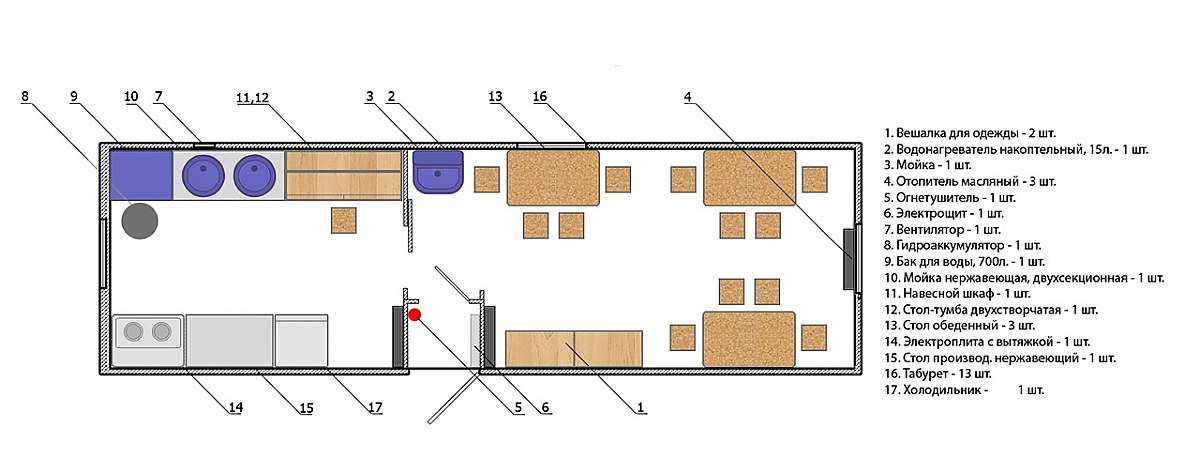 Организация стандартных вариантов модульных столовых обычно предполагает использование нескольких помещений, располагающихся на территории 8 на 2,5 метров: